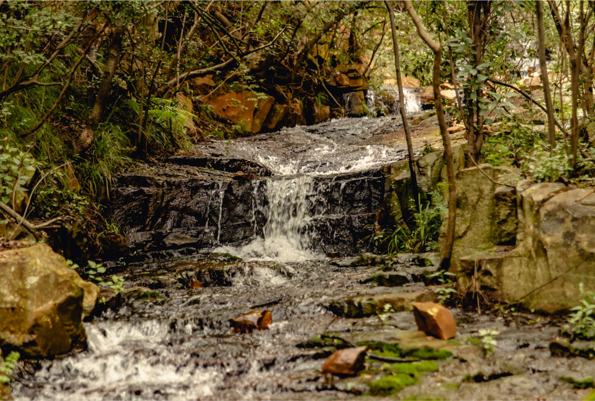 The valley hosts a cornucopia of indigenous plant and animal life, thriving on a river of natural spring-water that flows from water-falls and rock pools, down into forests and small gorges. Walking trails allow for day excursions around the valley along the tall cliffs and into our beautiful forested amphitheater. The night sky provides a clear view of the stars. The valley has a cosy ambiance, surrounding the tranquil venues with plush green slopes in summer and warm golden grasses in winter - looking out over the Magalies valley rolls up against its famous southern cliffs for picturesque sunsets.