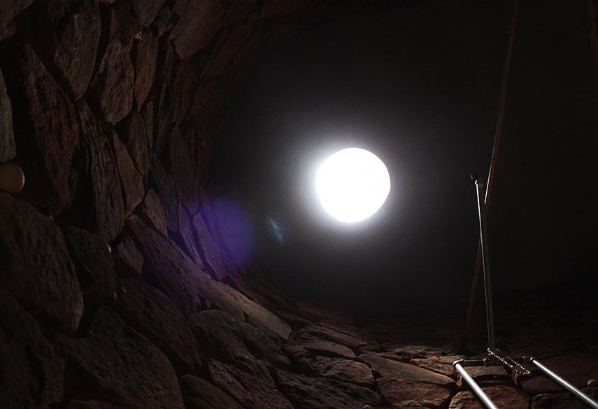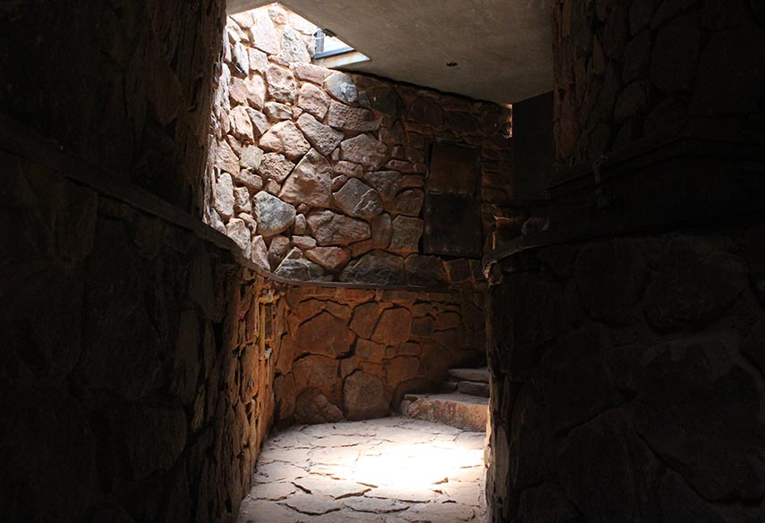 Welcome to our house in the hill. The valley is located in an area famous for its ancient fossils and stone-age implements that connect us to our distant ancestors who used to live in these very hills. Something about this site in the valley just invoked in us the urge to build a cave. The cave was created by excavating into the mountain side and building into the cavity a deep rock lined bunker. Once a thick concrete slab had been cast to cover the space, the slope was pulled back on over, hiding the internal structure.