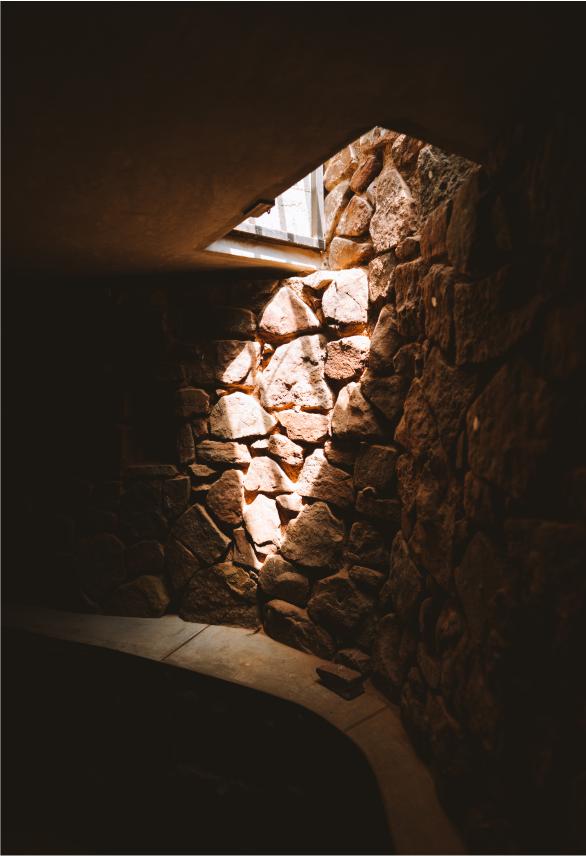 "The Cave has a warm & cozy feel, with natural light flowing in from skylights along the high stone walls onto soft wooden finishes."
