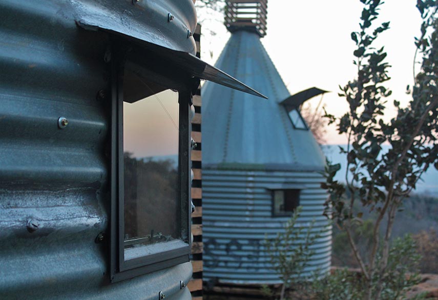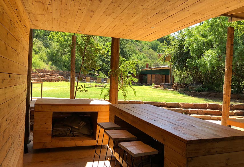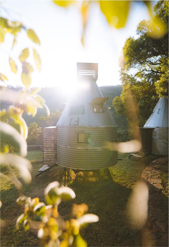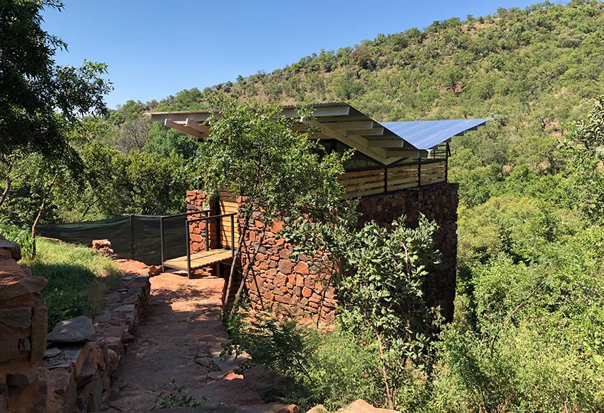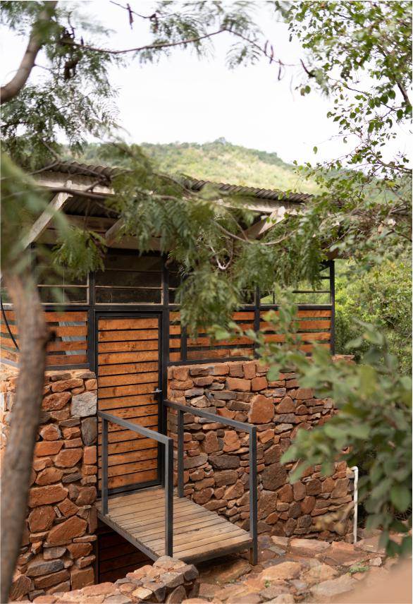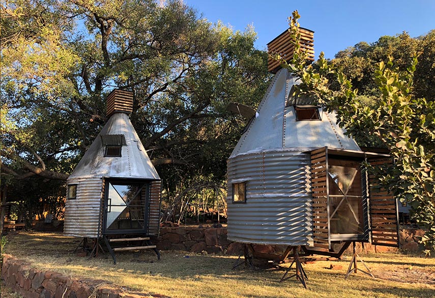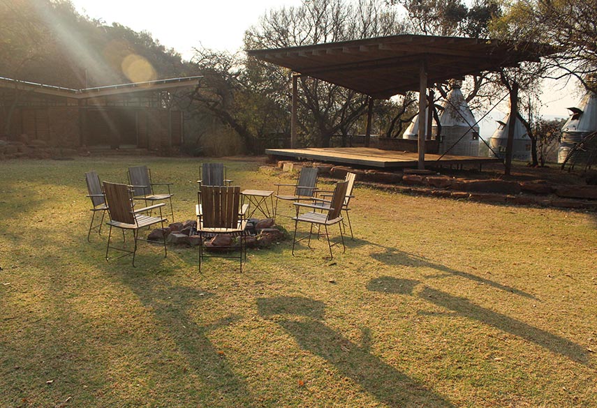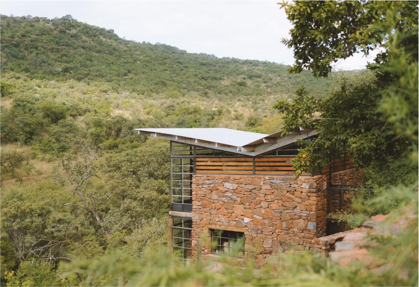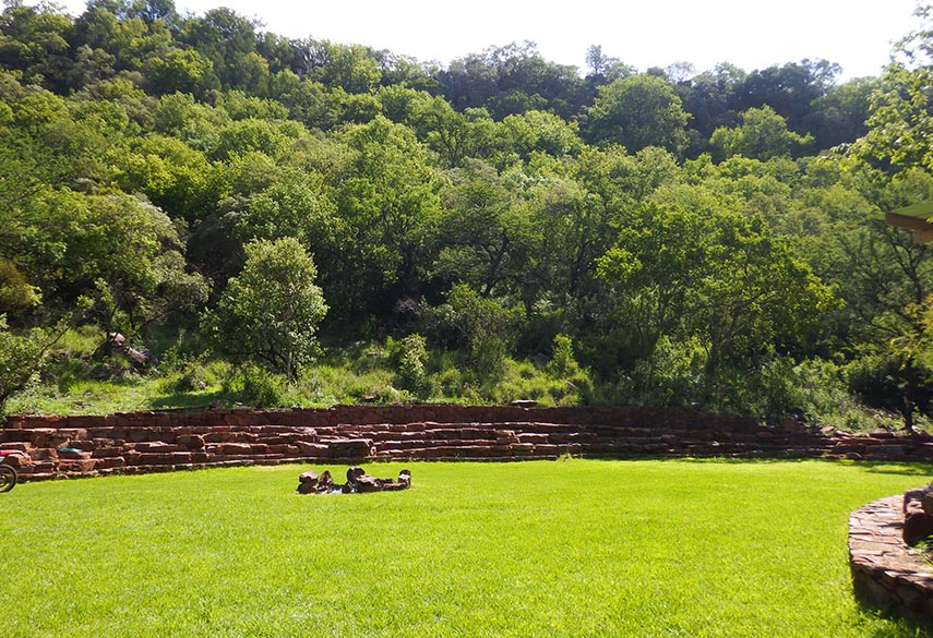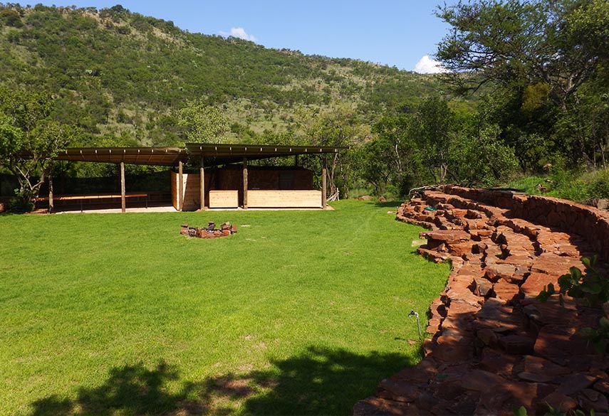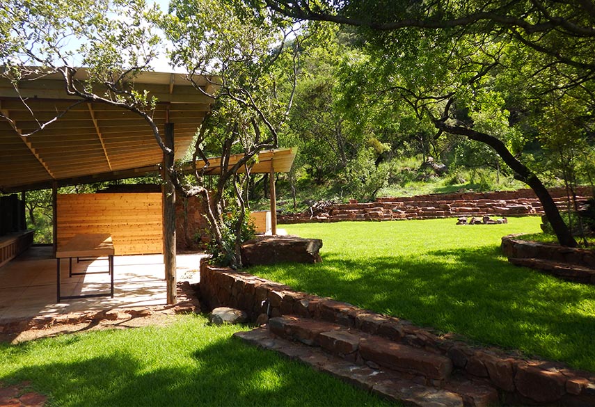 A mixture between an Incan village and a modern, bush-veld glamping experience. A series of lawned terraces built on a shelf beneath majestic cliffs, overlooking the rest of the valley and the Magalies mountains.