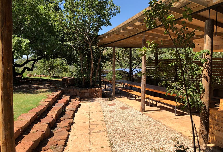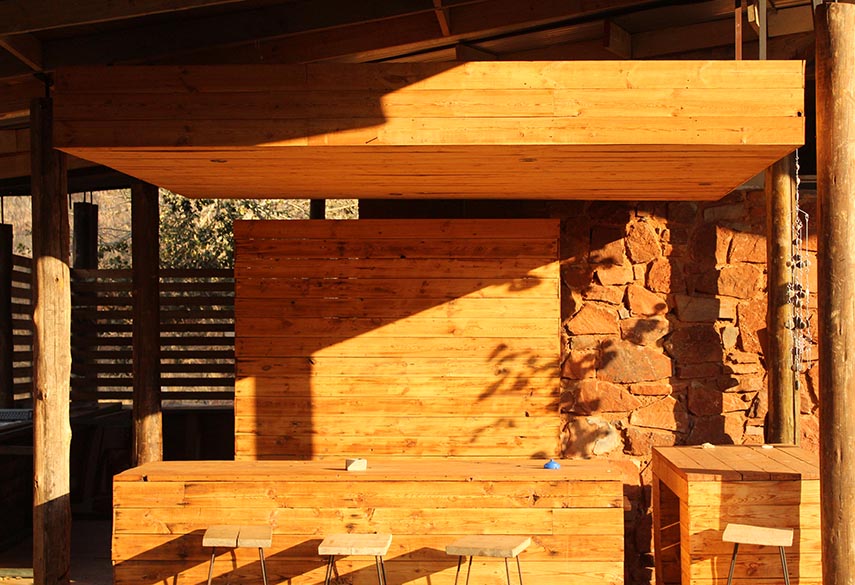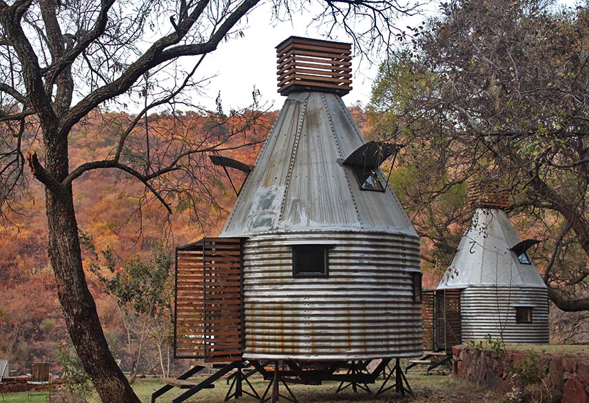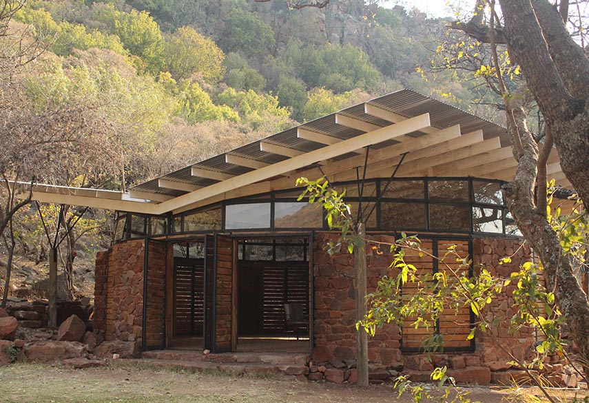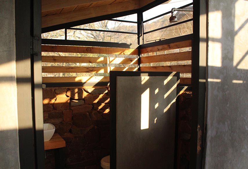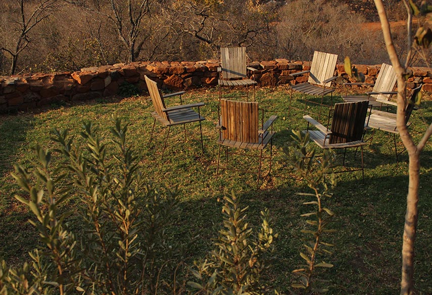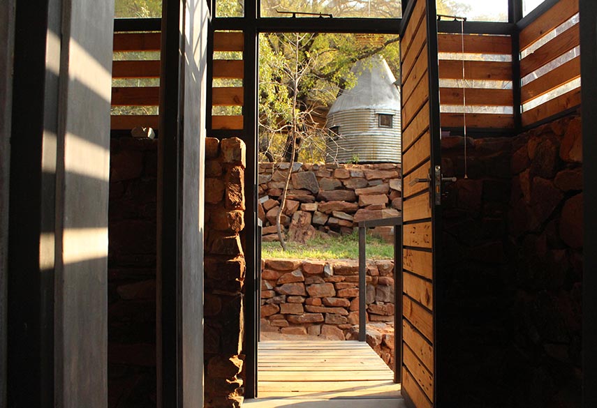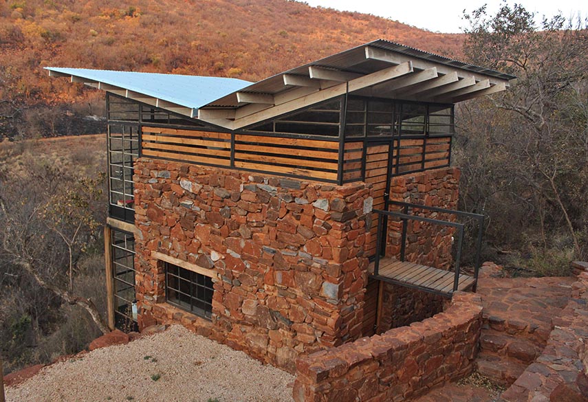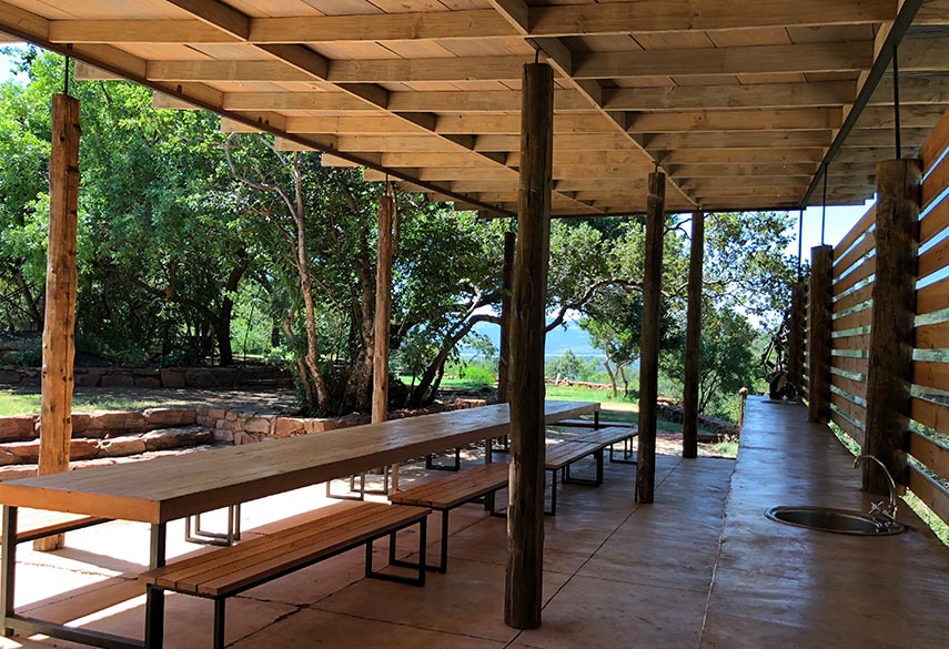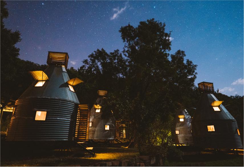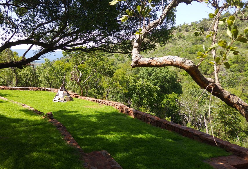A mixture between an Incan village and a modern, bush-veld glamping experience. A series of lawned terraces built on a shelf beneath majestic cliffs, overlooking the rest of the valley and the Magalies mountains.